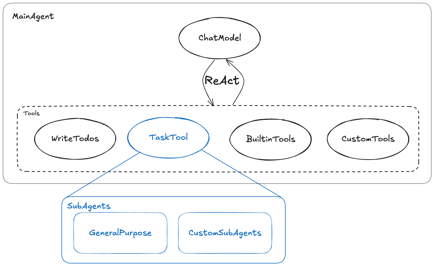 The core concept of DeepAgents is to use a main agent (MainAgent) to coordinate, plan, delegate, or autonomously execute tasks. The main agent uses its built-in ChatModel and a series of tools to interact with the external world or decompose complex tasks to specialized sub-agents (SubAgents).